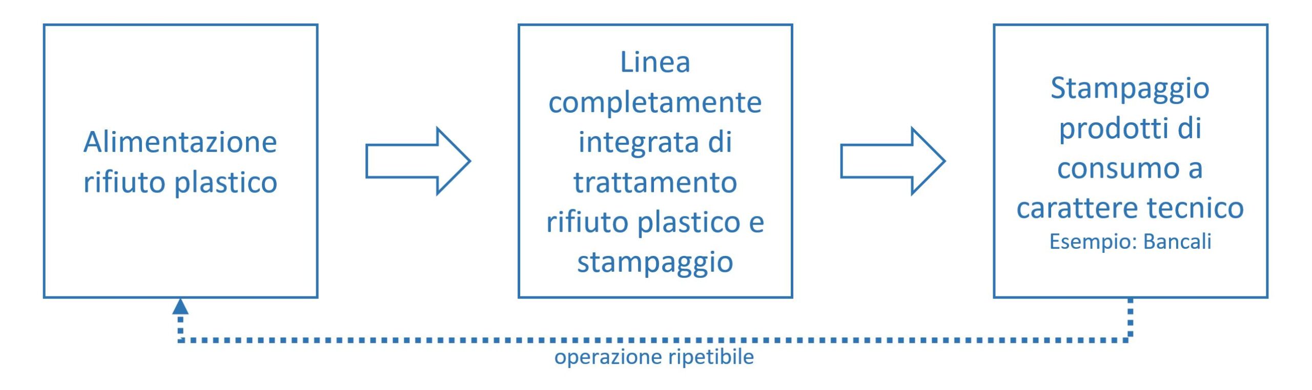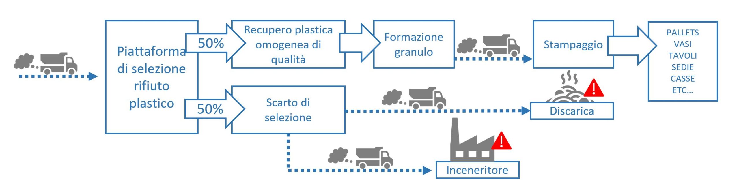 The waste obtained from the selection of plastic waste is transformed into a new material defined "plastic conglomerate" which will generate, by molding, new products: thanks to the new technology it is avoided to bring plastic waste to landfills or to the incinerator and also to create environmental problems.